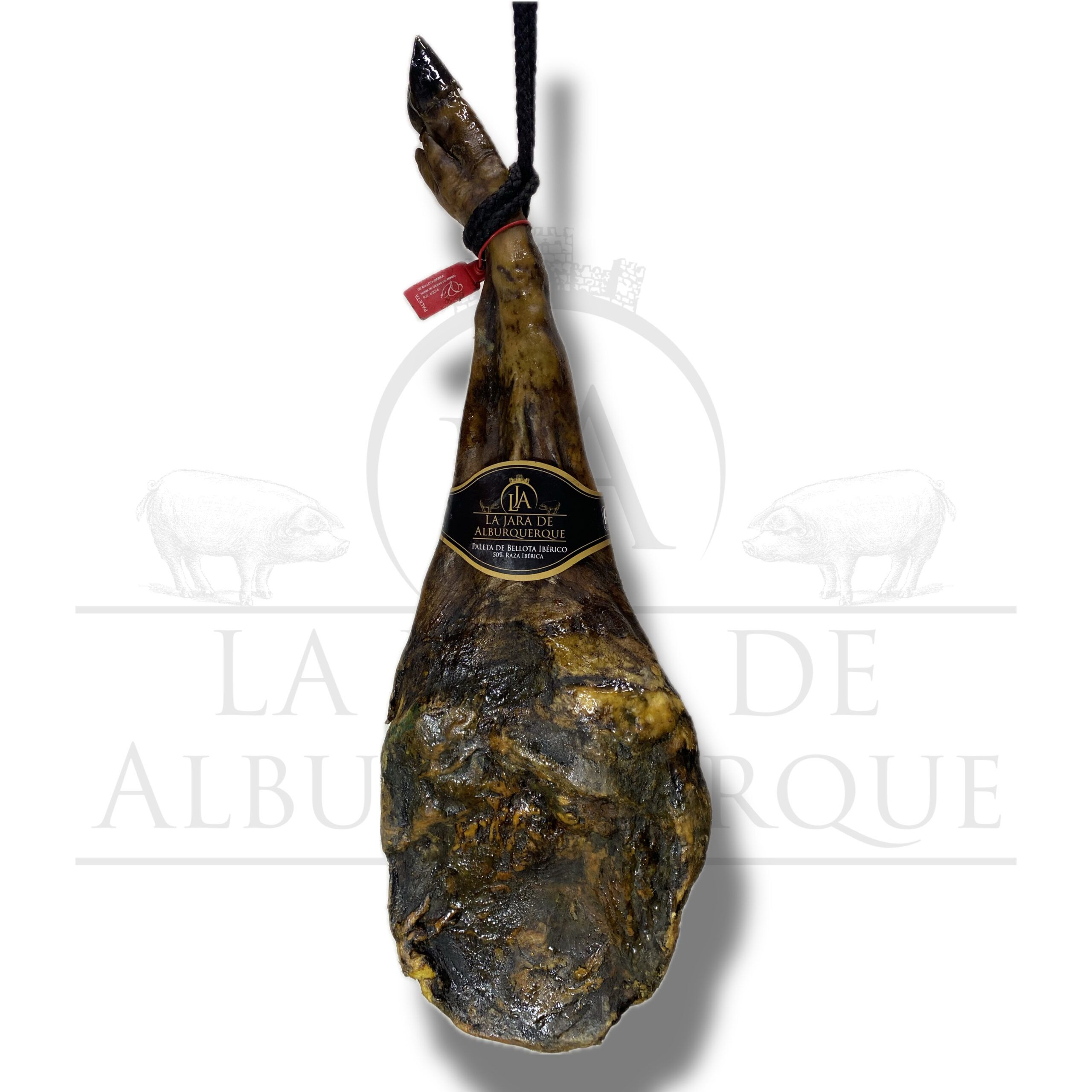 Paleta de Bellota Ibérica 50%. Esta paleta proviene de cerdos criados en el campo y alimentados con bellotas pero que no son de raza ibérica pura. Curados lentamente en secaderos naturales.